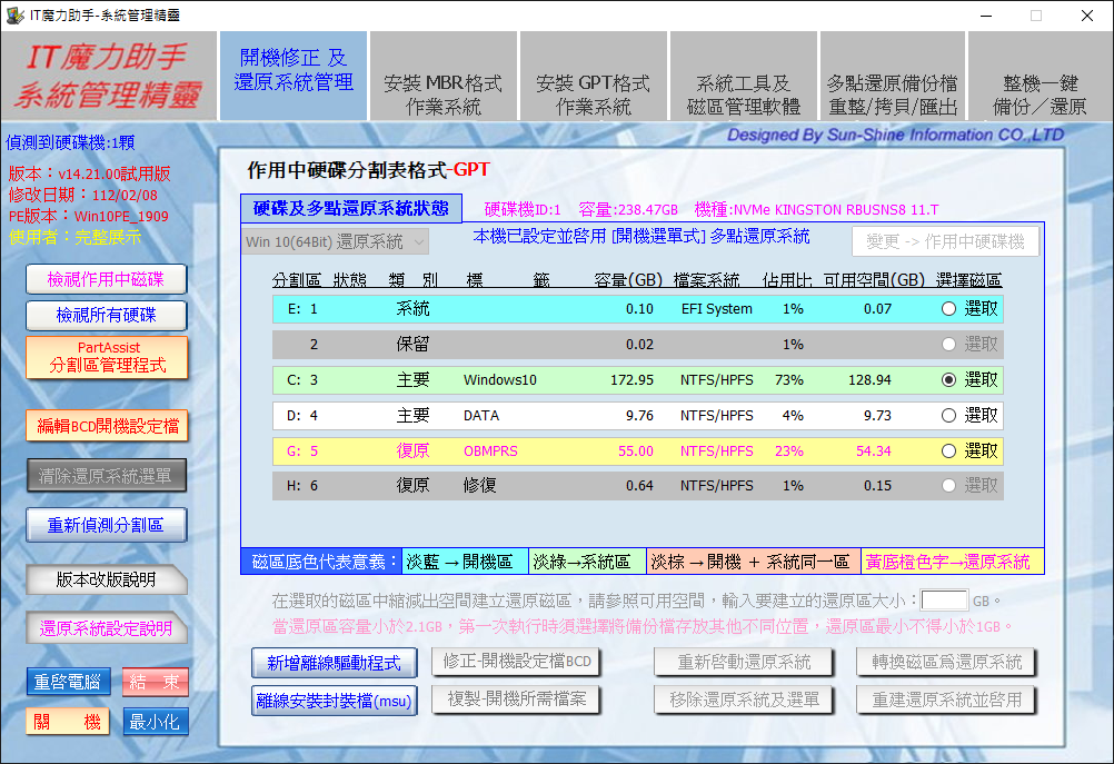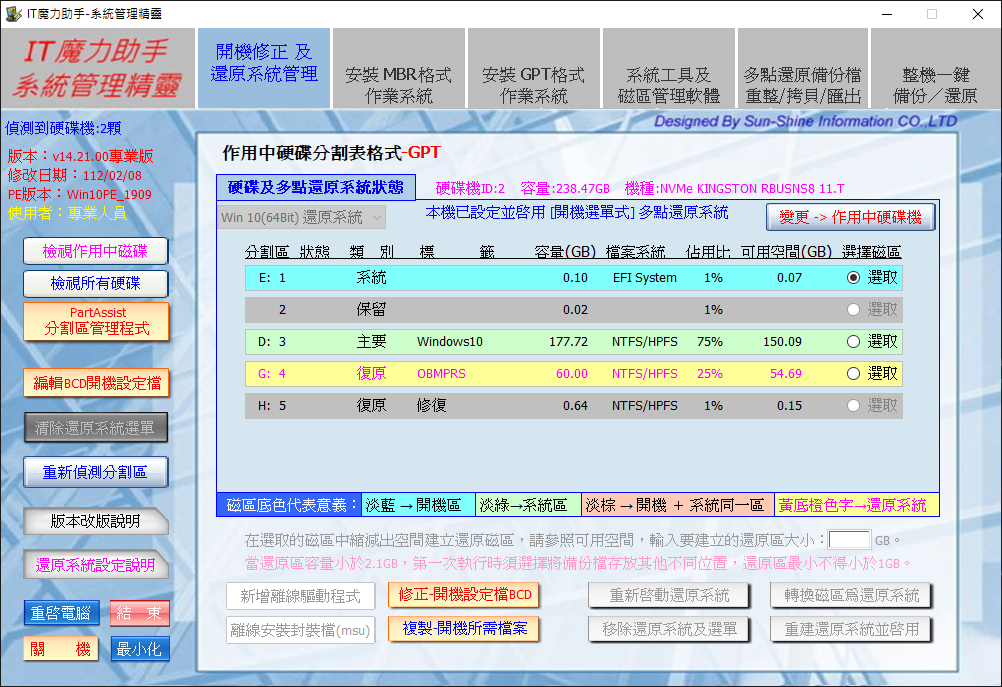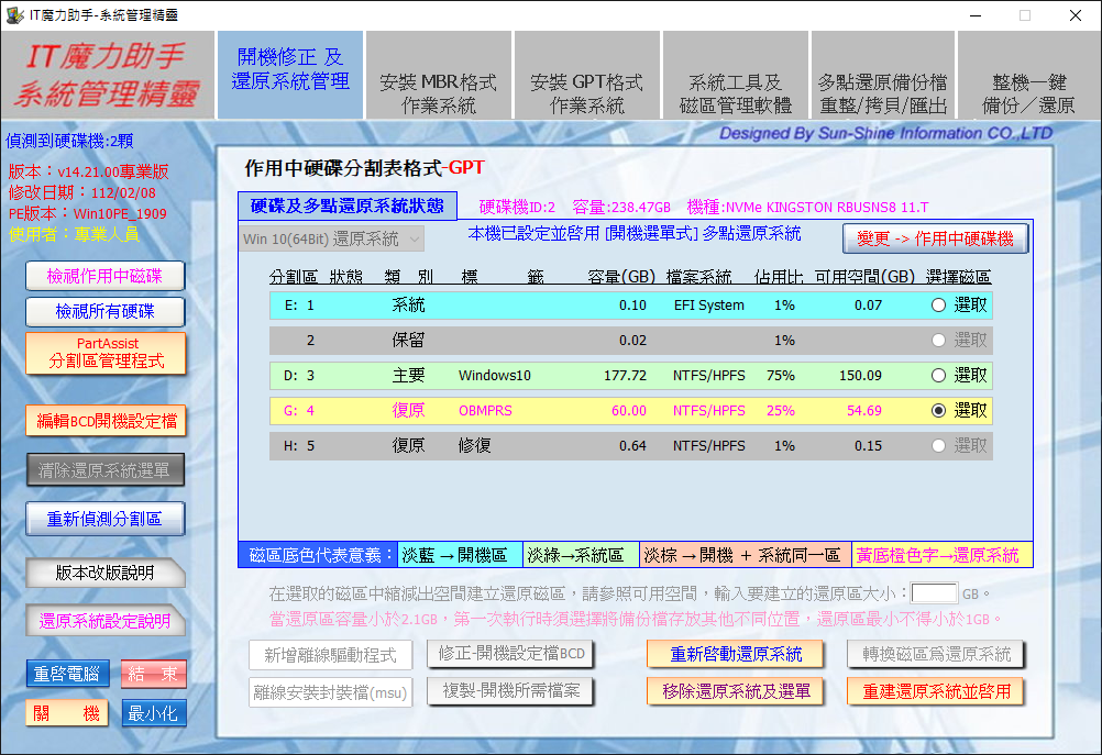 可轉換/建置/重啟及刪除多點還原磁區。