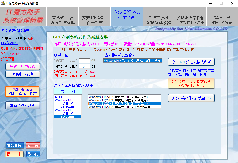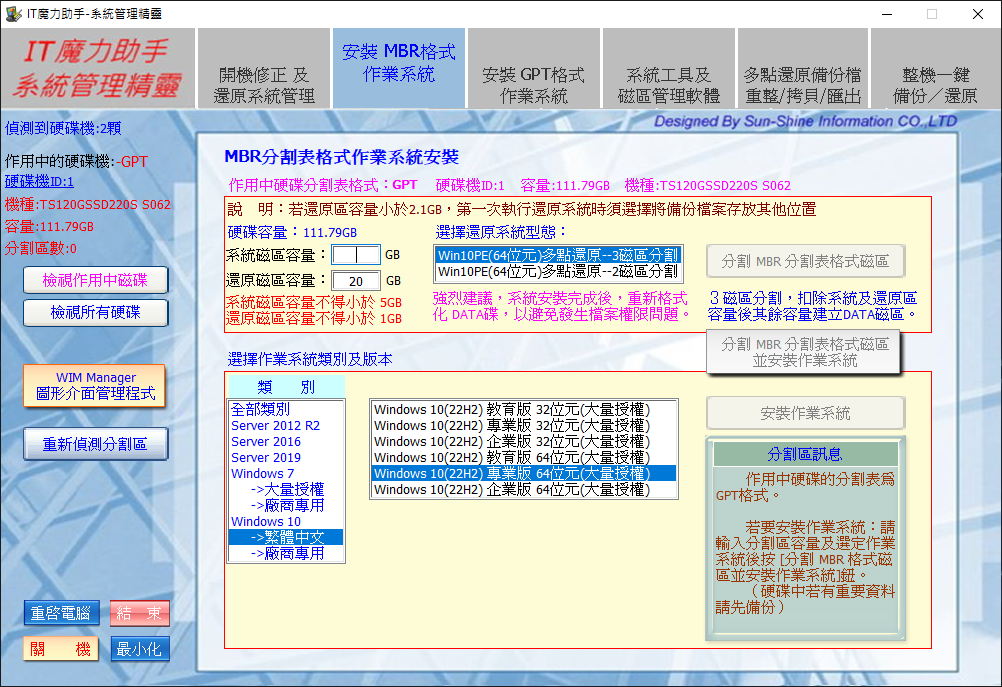 支援MBR以及GPT分割表格式安裝。