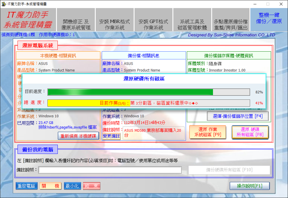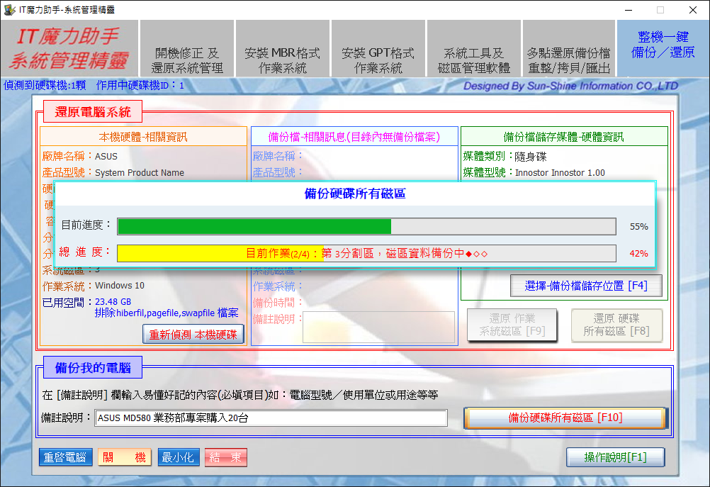 也可以準備一個大容量隨身硬碟建立多個電腦整機備份資料庫,以供大量佈署或故障救援使用 。