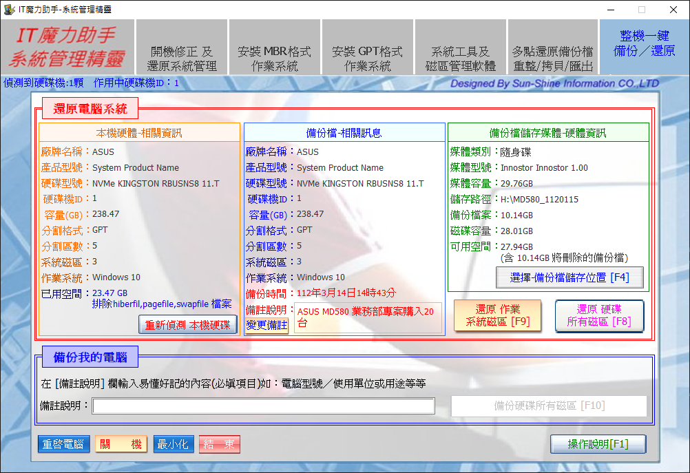 當電腦安裝設定完成後,可使用整機一鍵備份功能建立備份檔案 。