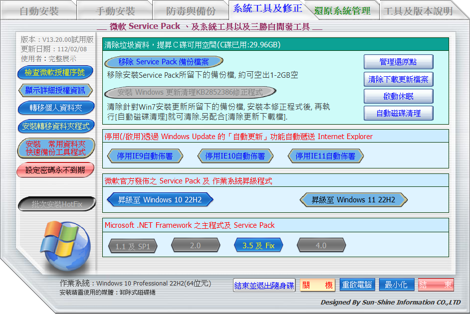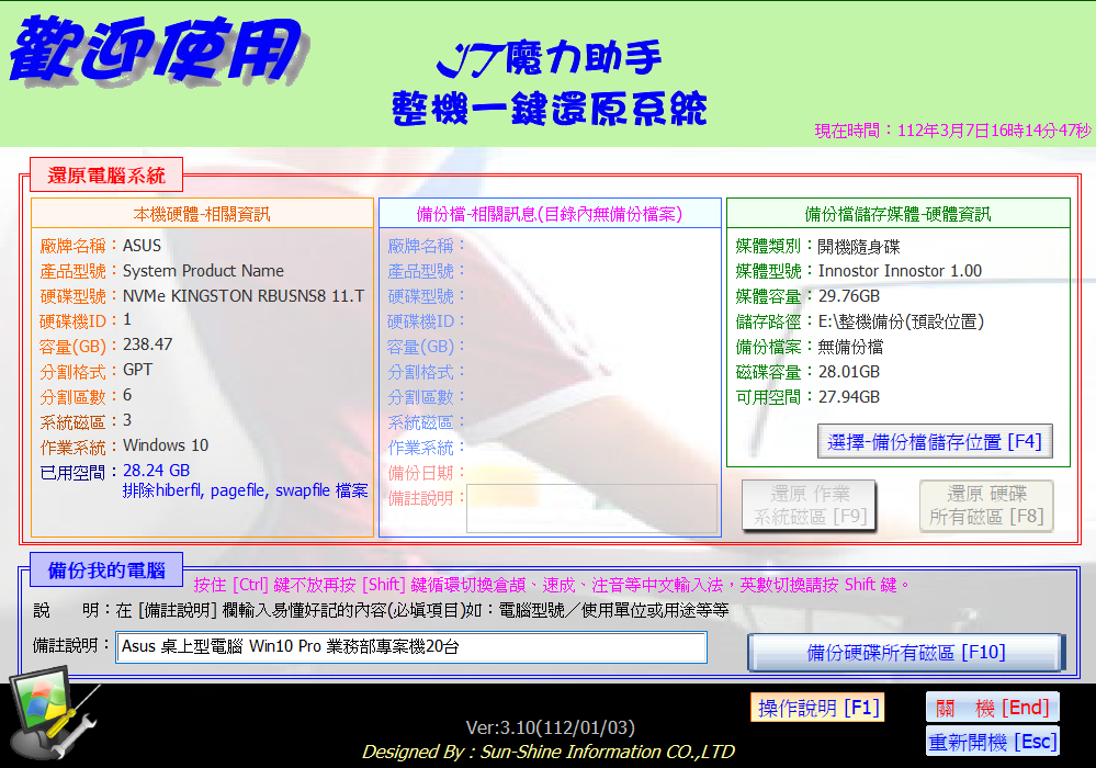 提供自行開發工具,建置整機一鍵還原隨身碟、啟動還原系統、重置預設作業系統等相關軟體。