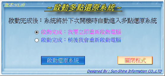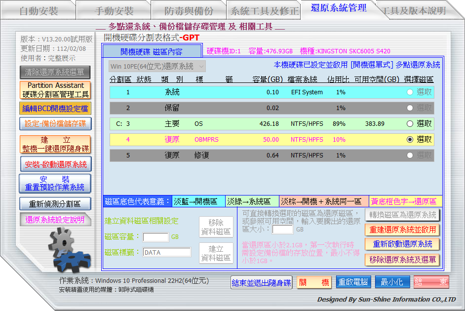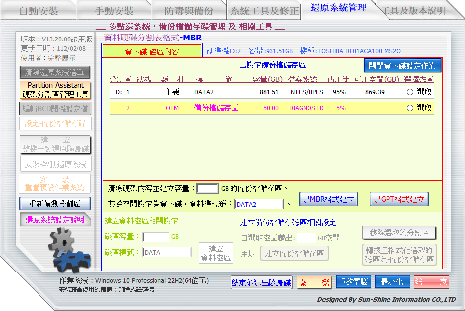 建置/重啟及刪除多點還原磁區;新增/刪除一般資料磁區。
